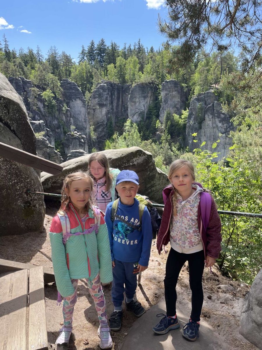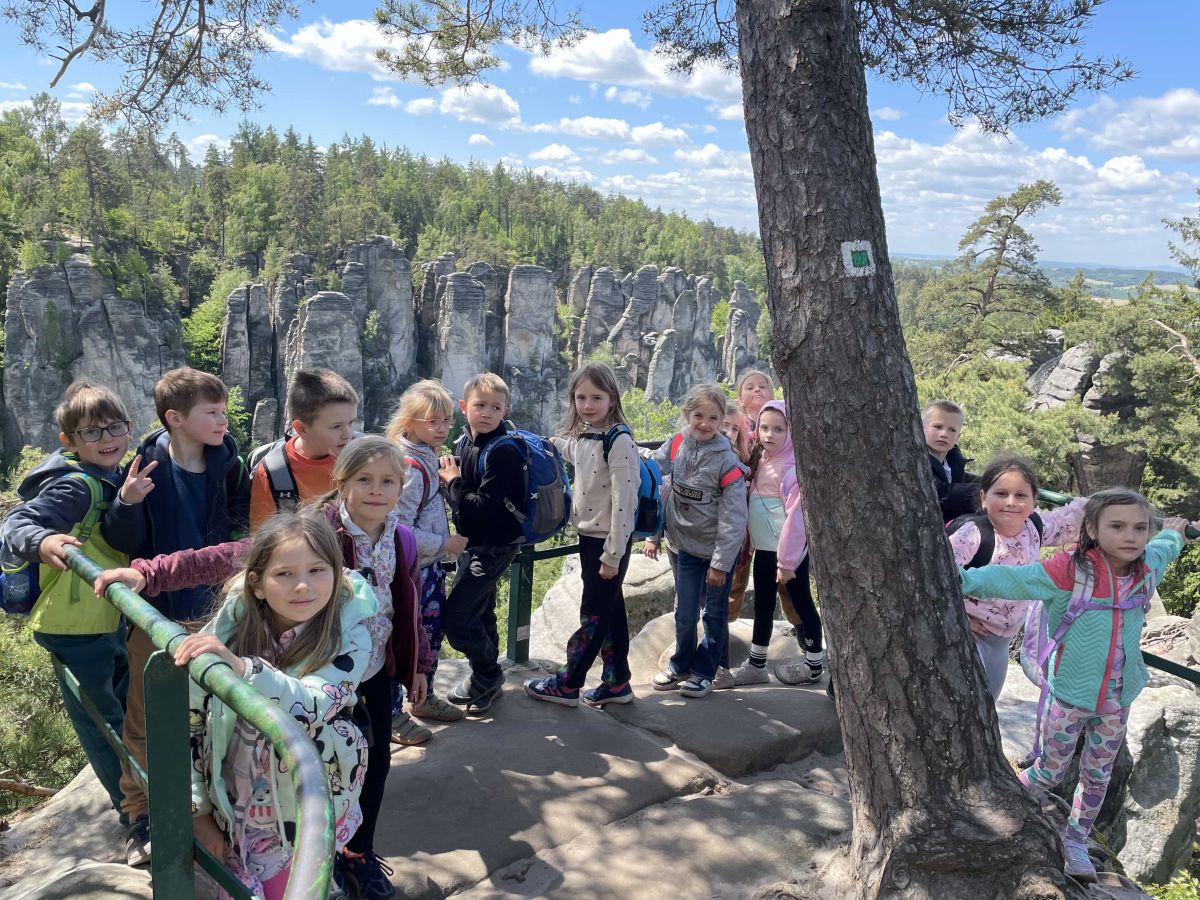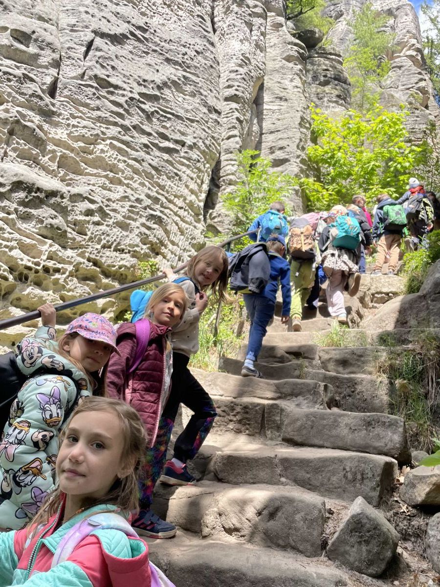 Poté jsme se přesunuli do Prachovských skal, kde jsme si užívali nádherné přírody. Obdivovali jsme skalní útvary, ale nejvíce nás nadchlo procházení úzkých soutěsek. S nadšením jsme zdolávali nesčetné množství kamenných schodů a z vrcholu skal se nám rozprostřel pohled na malebnou krajinu Českého ráje.
