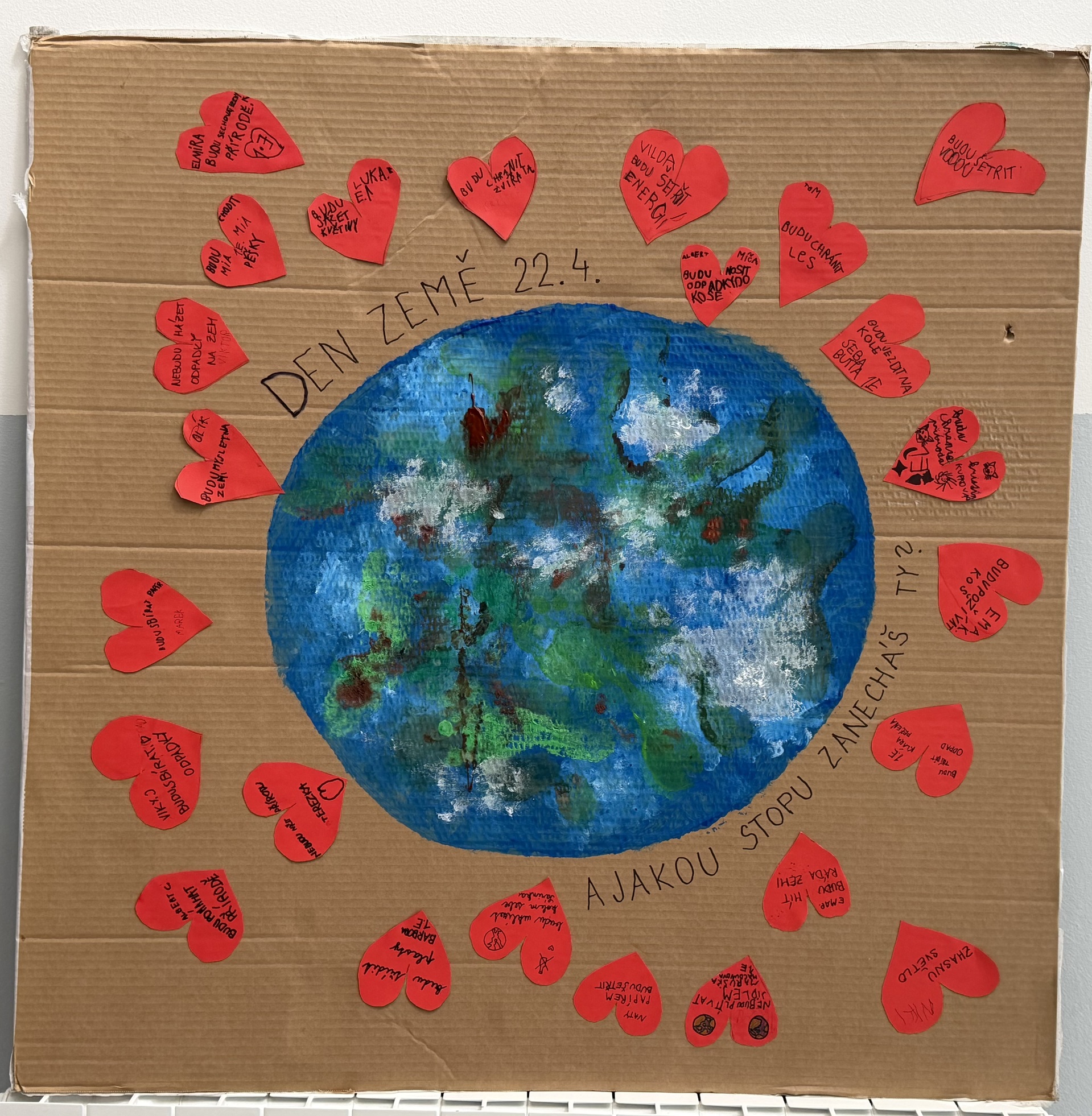 Na velké modré planetě si děti otiskly své nohy jako symbol vlastní stopy. Každé dítě přidalo i osobní vzkaz na srdíčku, kde sdílelo, jak se chce k naší planetě chovat s láskou.